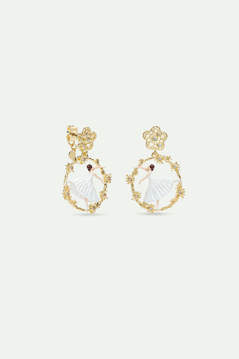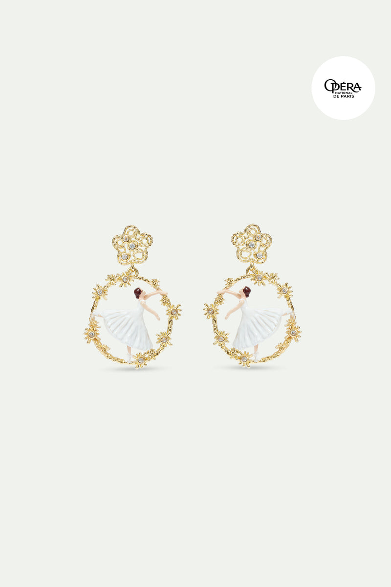Earrings composed of a hand-enamelled dancing ballerina wearing a white tutu, a filigree openwork flower and gold-plated brass dangling circle, cubic zirconia. To celebrate the 150th anniversary of the Palais Garnier, Les Néréides has designed a collection of jewellery infused with the very spirit of the Opera. This collection takes you on a journey through the most romantic of ballets, Giselle.